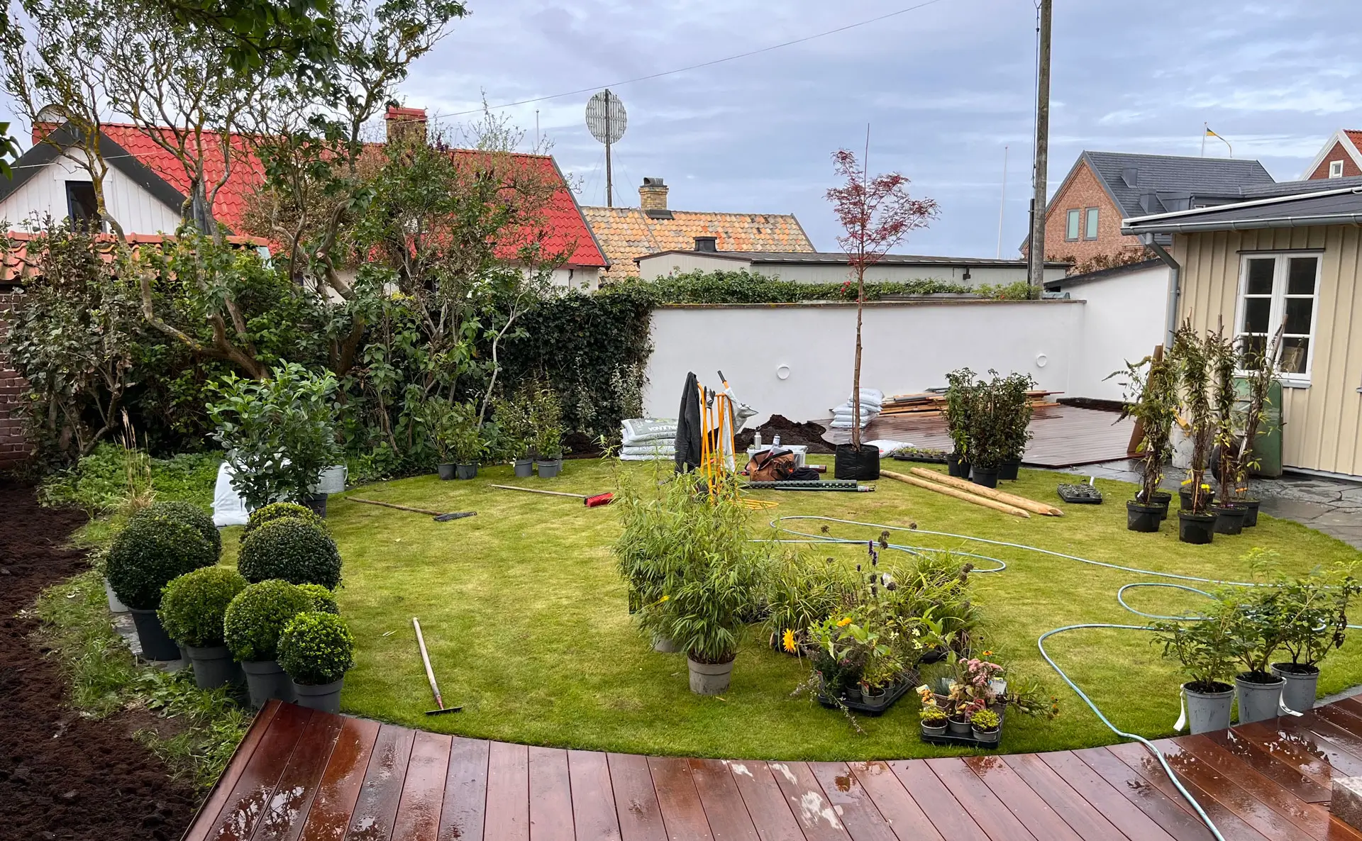 Efter att ha tänkt igenom ditt projekt och kanske också ha tagit in råd från kunnigt håll, beställt växter i god tid och förlagt planteringstillfället till rätt tid så har du gjort vad du kunnat för en god etablering av träd- gårdens nya växter. Fortsätt dock att ha vattenslangen nära till hands. Foto: Pontus Eriksson