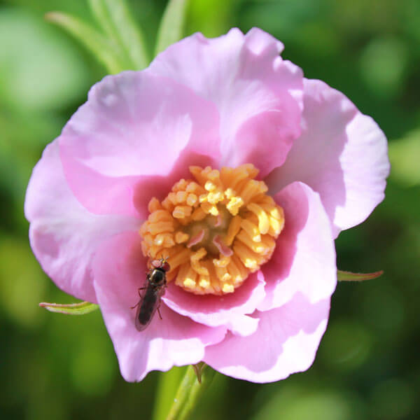 Nickande enkla ljusrosa blommor med gul mitt och finflikiga, blanka blad. Den finns även i vitt, ’Alba…