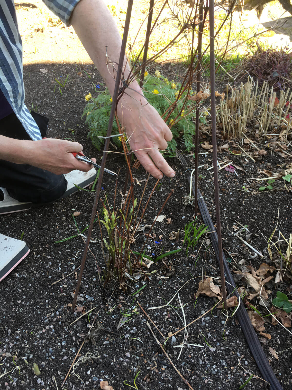 En Viorna-klematis får en behövlig nedskärning. Den blommar på årsskotten, därför sparas bara cirka tjugo centimeter, eller ett par livskraftiga skottknoppar. Foto: Per WålerydGrupp 1Huvudblomningen är i maj–juni.Klematis i den här gruppen blommar på fjolårs-veden. Blomanlagen är anlagda året innan och blomstjälkarna växer direkt ut från föregående års stänglar. Man beskär inte dessa klematis före blomningen, då skär man ju i så fall bort årets blomning. När plantan efter några år börjar bli ranglig och blomningen blir sämre kan man göra en föryngringsbeskärning ner till 50–100 cm höjd. Detta gör man i juni–juli efter blomningen.Klematis i denna grupp: Bland andra Atrageneklematis (alp-, kron-, koreansk- och sibirisk klematis), Montana-klematis.Grupp 2Huvudblomningen är i juni–juli.Klemat…